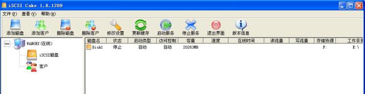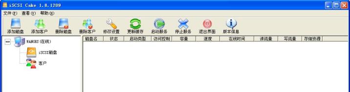 下面的图显示的是主界面: 1.添加磁盘:添加iSCSI磁盘。 2.添加客户:添加新客户。默认设置是自动添加客户。如果iSCSI盘不是默认盘,则需要手动添加客户。 3.删除磁盘:删除iSCSI磁盘。 4.删除客户:删除客户。例如当观察到客户流量异常时可以手动删除该客户。 5.修改设置:修改服务器设置。 6.更新缓存:在服务器更新数据后需要刷新缓存。如果是用超级客户端更新数据,缓存会自动刷新,不需要手动刷新缓存。 7.启动服务:启动iSCSI服务。 8.停止服务:停止iSCSI服务。 9.退出界面:退出用户界面,后台服务仍然在运行。 10.版本信息:版本信息和注册软件。