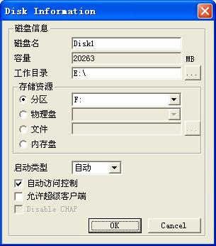 点击“添加磁盘”,弹出磁盘属性设置对话框: 1.磁盘名:磁盘名字。 2.容量:源盘的容量。 3.工作目录:用来存放客户数据文件 。 4.存储资源:用来共享的分区或者物理磁盘。 5.启动类型:默认为自动,服务启动时磁盘自动启动。 6.默认盘:选上则自动添加客户。 7.允许超级客户端:允许客户从客户端更新数据。如果存储资源是分区,当iSCSI磁盘运行时,本机不能访问该分区。如果存储资源时物理磁盘,需要手动在磁盘管理里面删除该磁盘上的所有盘符。(注意:是删除盘符不是删除分区,删除分区会造成无法挽回的数据破坏。)停止iSCSI磁盘或者禁用超级客户端后可以再把盘符恢复。