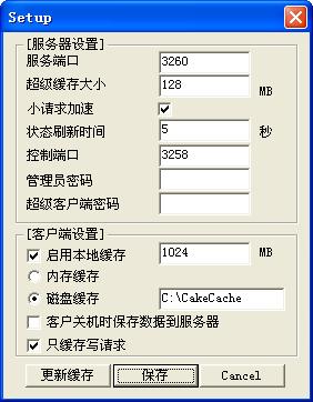 CCDISK的默认设置适用于绝大多数情况,当然你也可以点击“修改设置”来修改服务器设置: 1.服务端口:默认3269。 2.超级缓存大小:服务端缓存大小,单位为兆字节。 3.小请求加速:加快小请求相应速度。 4.状态刷新时间:状态刷新时间间隔,单位为秒。 5.控制端口:用来和用户界面通讯的端口。 6.管理员密码:用户界面登录的密码。 7.超级客户端密码:超级客户端密码,长度为12-15位。客户端通过打开高级选项里面的CHAP选项输入密码。 8.[客户端设置]:下面的设置需要在客户端安装本地缓存配合使用。 9.启用本地缓存:是否启用本地缓存,缓存大小单位为兆字节。 10.内存缓存:用客户端的内存做缓存。 11.磁盘缓存:用客户端的磁盘做缓存,需要指定缓存目录。 12.客户关机时保存数据到服务器:客户断开时把缓存里面的数据刷新到服务器。 13.只缓存写请求:只缓存写请求,不缓存读请求。